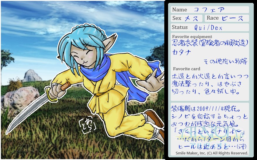 絵はそんなmixiのアプリRPG「アルヴィオン」のMyキャラ、コフェアです。珍しくPixivにあげた絵を転載。