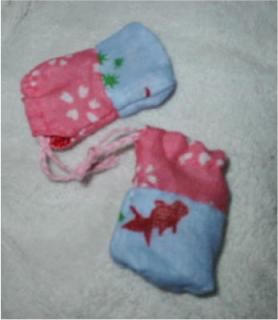 ・・・本当はもっと三角にしたかったんだけど、型紙とかなしで一発縫いなので、色々微妙(苦笑)。柄もドールサイズにはちと大きいので(特に金魚)、いまいちちゃんと柄が出なかったんですが。